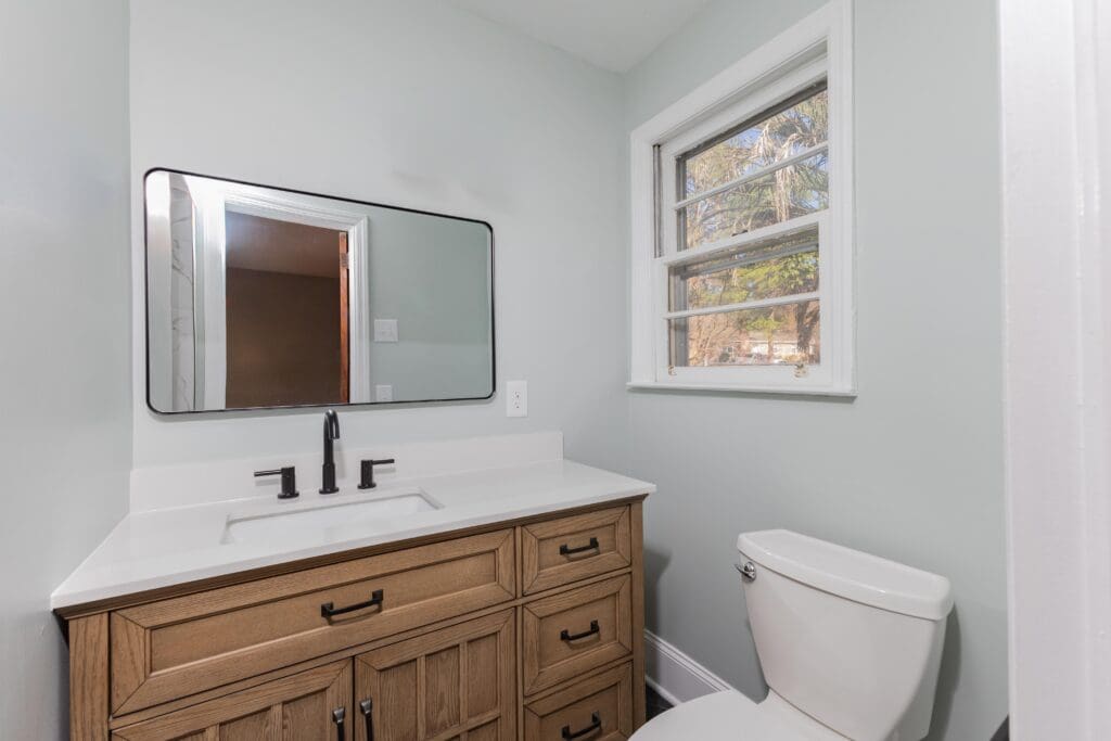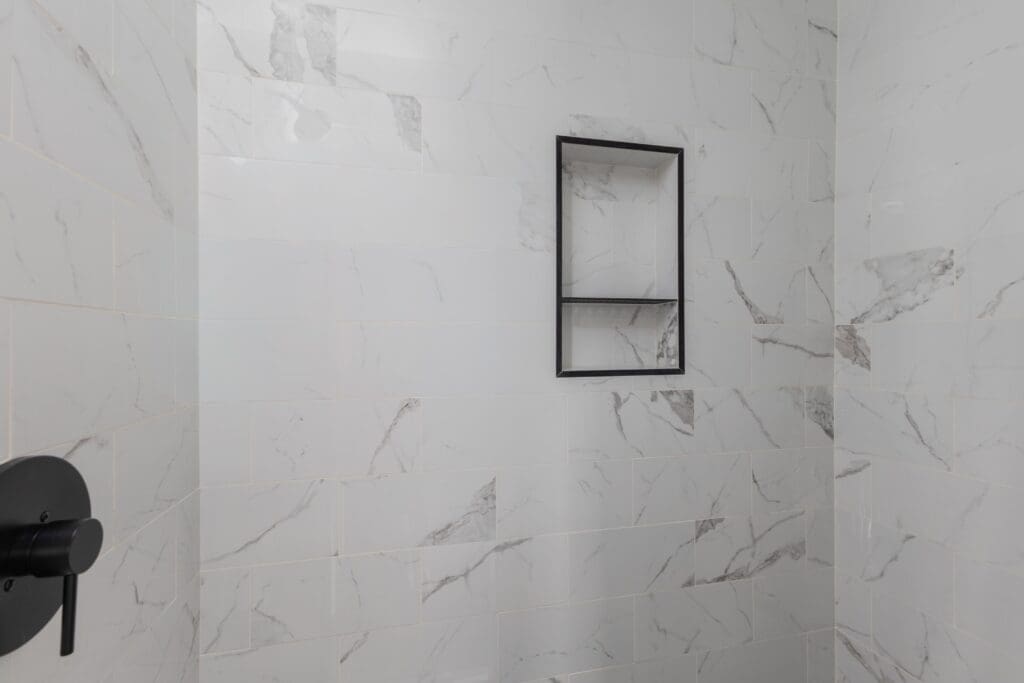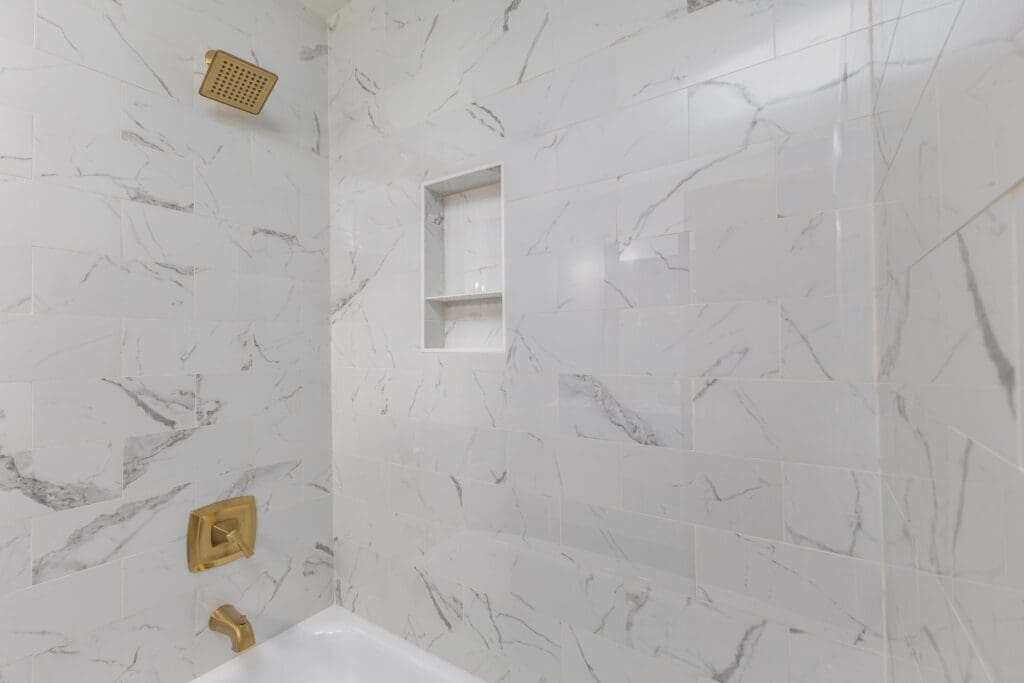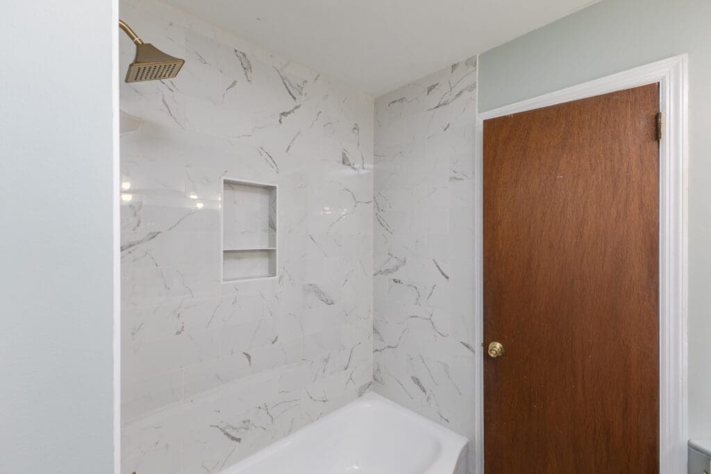 - Renovated Primary Bathroom With Tile Flooring, Tiled Walk-In Shower, and Stained Vanity