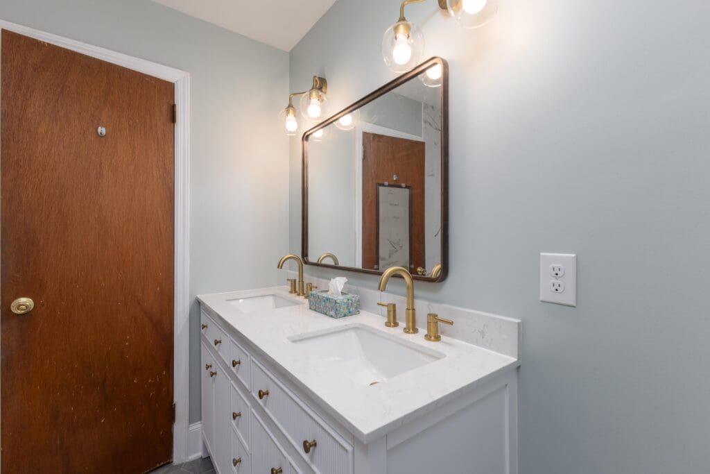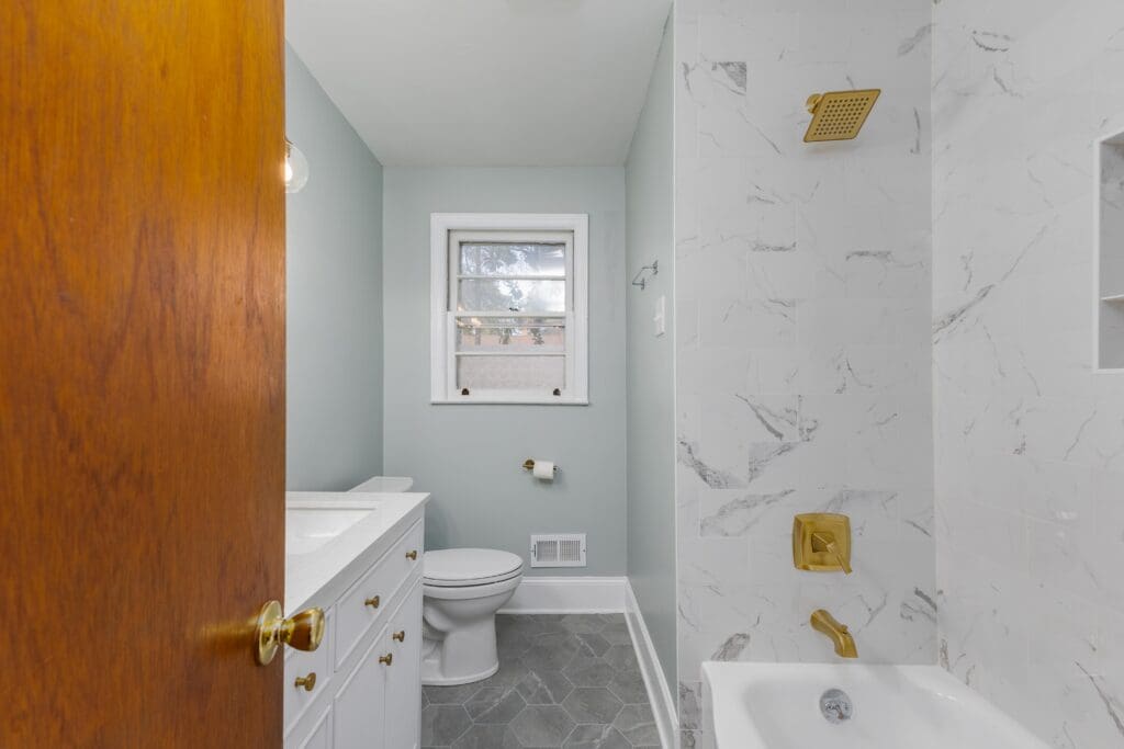 - Newly Renovated Shared Bathroom With Stylish Tile Flooring, Tiled Tub/Shower, and A Dual Vanity Sink
