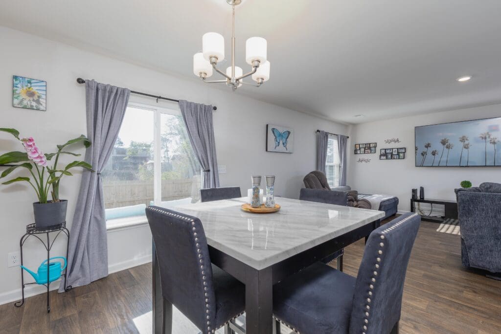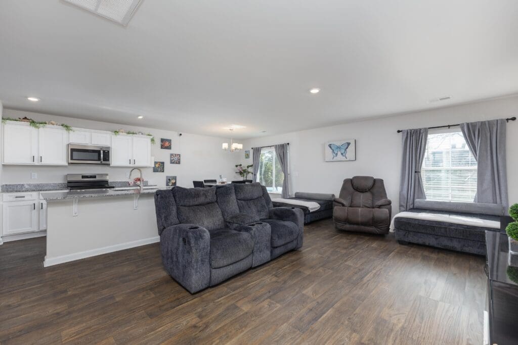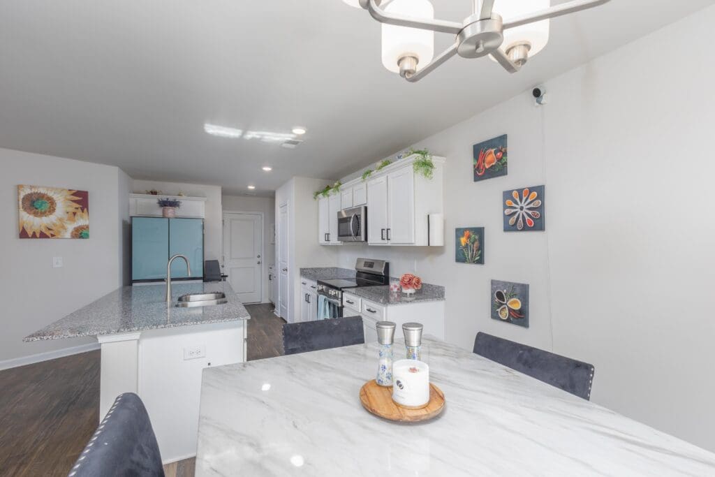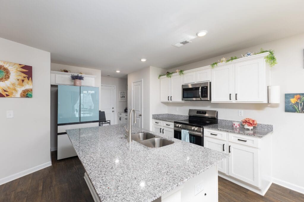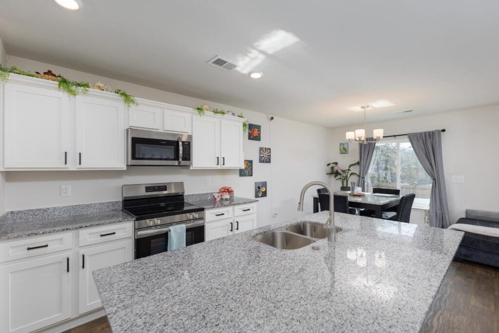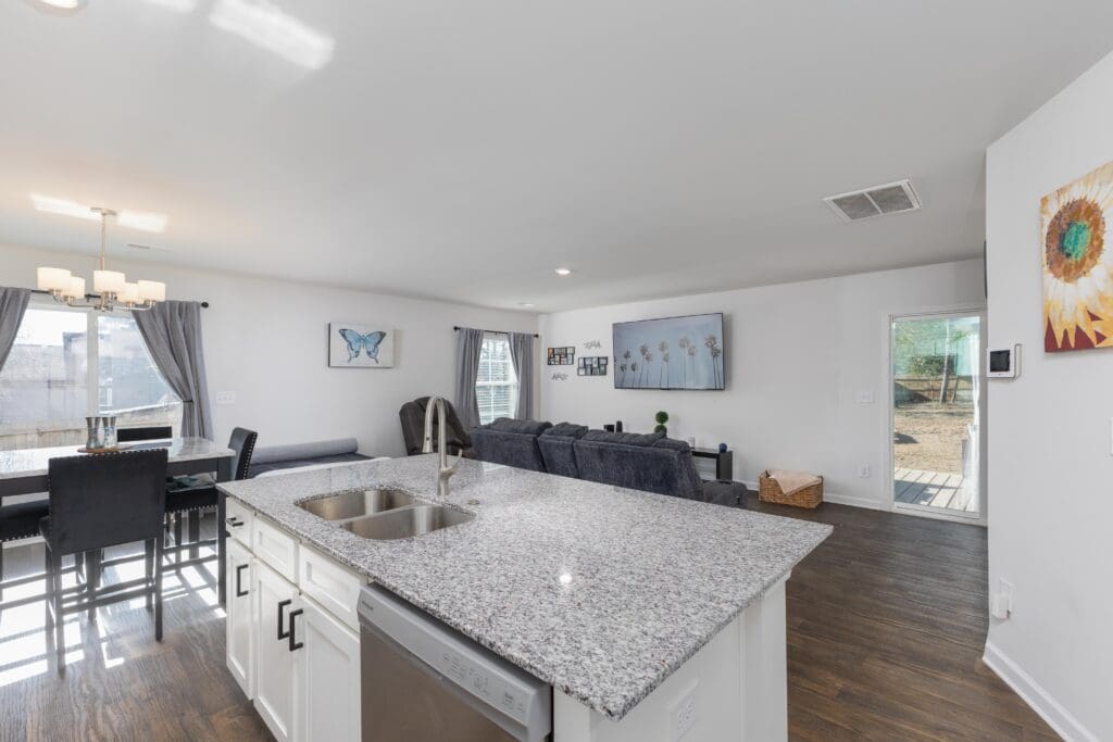 The main level features an open-concept design with durable vinyl flooring and a natural flow between the living, dining, and kitchen areas. The modern kitchen showcases white cabinetry, stainless steel appliances, granite countertops, a center island, and a dedicated dry bar/coffee bar just off the main living areas.