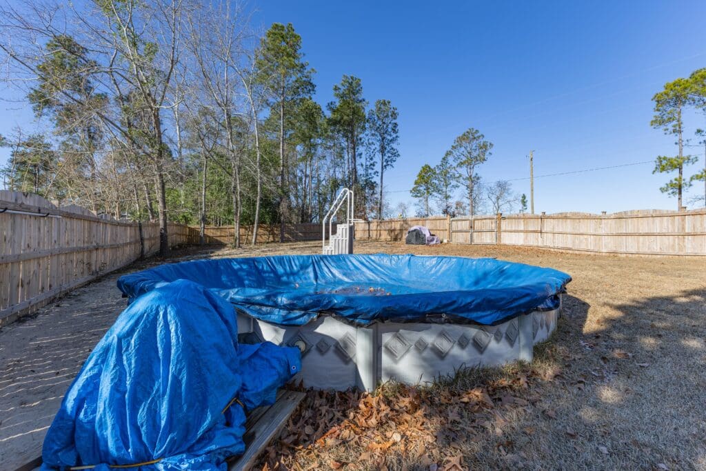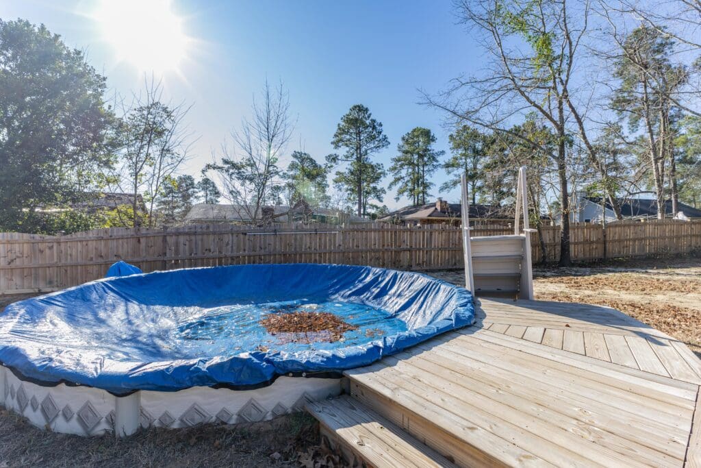 Outdoor living is enhanced by two separate entertaining areas — a concrete patio and an elevated deck — overlooking the fenced backyard. An above-ground pool with surrounding deck space adds an inviting touch for warm-weather enjoyment. The two-car garage provides additional storage and parking convenience.